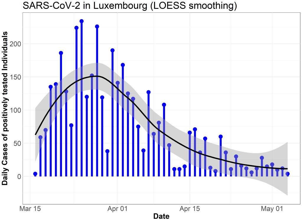 Le graphique 4 montre le nombre de nouveaux cas testés positifs journaliers. La ligne noire est une régression locale et représente la tendance.