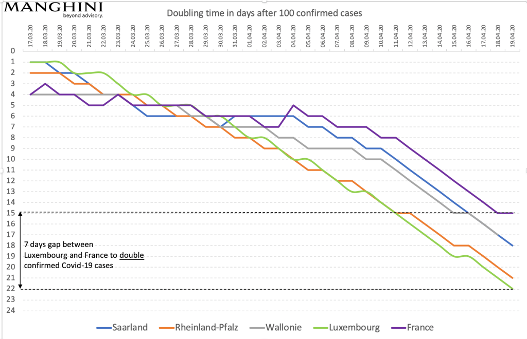 Pierre Mangers, membre SLS, vous propose le graphique ci-dessus décrivant le temps de doublement du nombre de personnes testées positives à partir d’un effectif de 100 personnes. Le graphique s’appuie sur les données officielles publiées pour une partie de la Grande Région. Plus la courbe est plate, plus le temps de doublement des personnes testées positives est court, donc plus la propagation du virus est élevée. A l’inverse pour le Luxembourg, la courbe descend plus vite traduisant une propagation plus lente du virus. Il montre aussi qu’il y a une différence de 7 jours à la date de mi-avril entre le Luxembourg et la France.